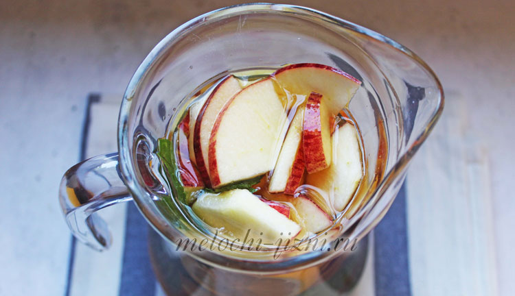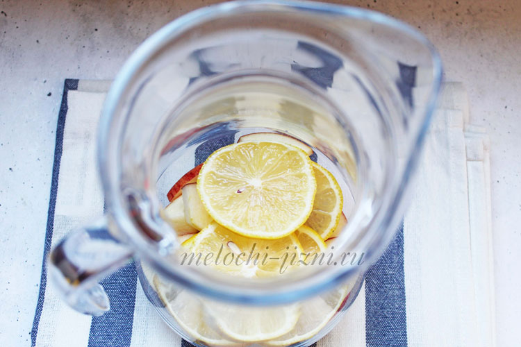 В стеклянный кувшин положите нарезанные яблоки, туда же сложите ломтики лимона.