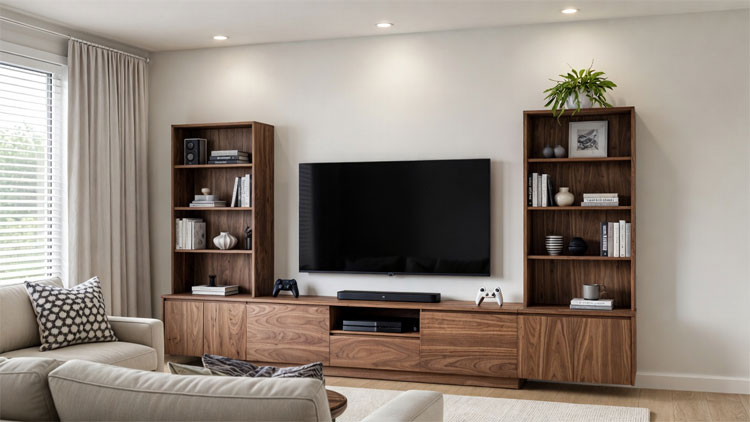 - Под высоту: Здесь важен комфорт для глаз. В гостиной, где смотрят сидя, идеальна высота 50-55 см от пола до столешницы. В спальне, где телевизор смотрят лёжа, потребуется более высокая тумба или настенное крепление с расчётом, чтобы центр экрана был на уровне вашего взгляда.