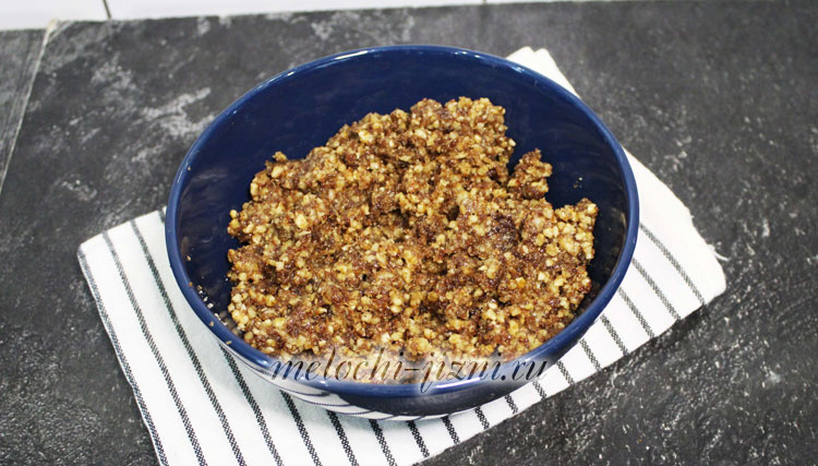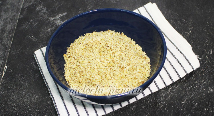 8. Пока тесто подходит приготовьте начинку для этого грецкие орехи измельчите, переложите в миску.