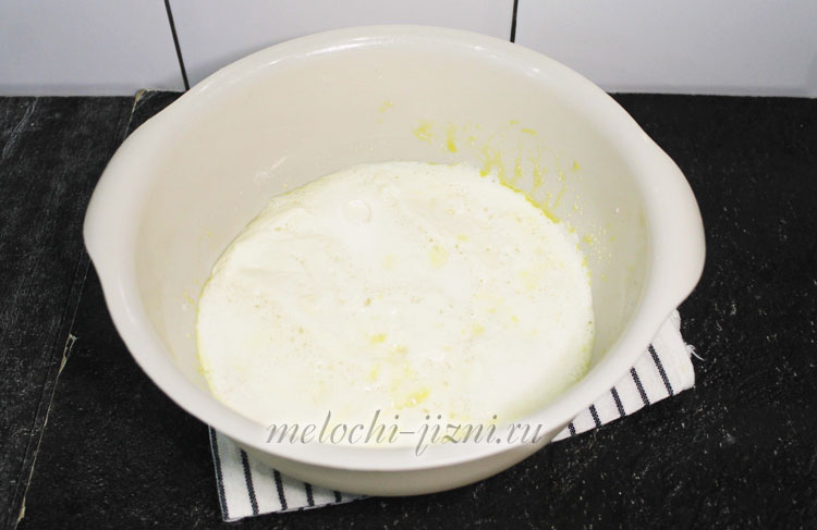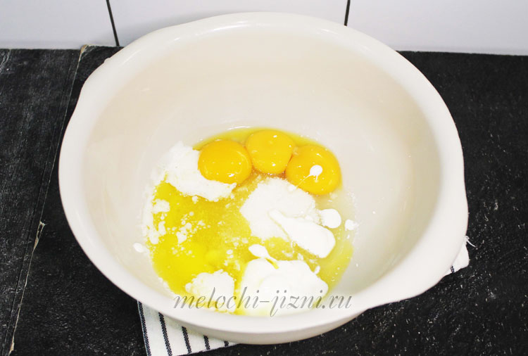 3. В другую миску положите желтки, добавьте растопленное сливочное масло, положите сахар, соль, сметану, все перемешайте.