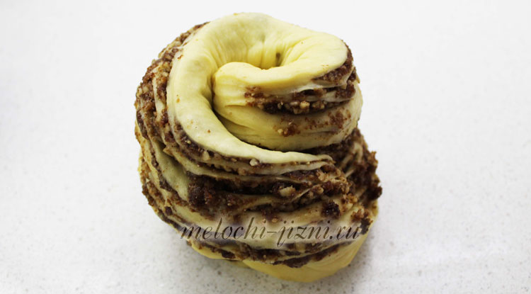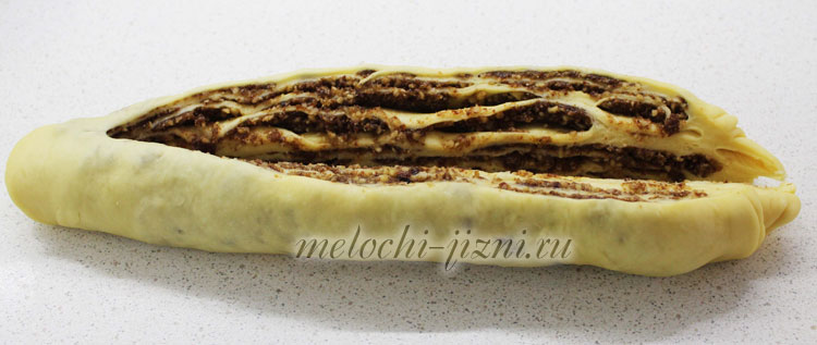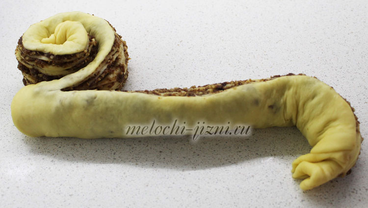 14. Две половинки улиток сложите друг на друга. Второй кусок теста раскатайте и сложите также.