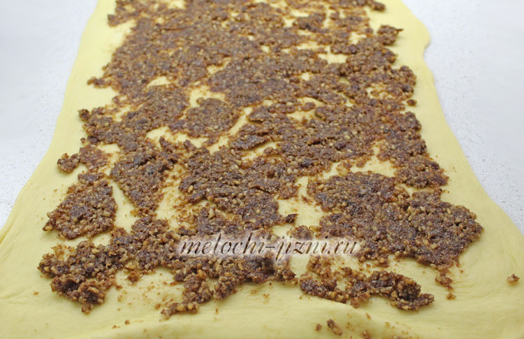 11. Подошедшее тесто разделите на две части. Одну часть тонко раскатайте в пласт толщиной около 3 мм. Выложите сверху начинку и равномерно распределите по всей поверхности.
