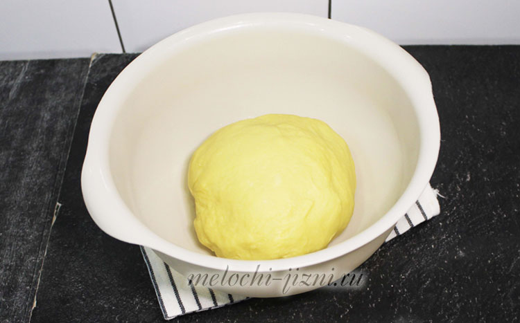 6. Тесто необходимо очень хорошо вымесить в течение 8-10 минут, можно немного подсыпать муки. Оно должно получиться мягким, эластичным, допустимо, что будет немного липковато. Тесто округлите, положите в миску, смазанную маслом, сверху накройте и оставьте подходить на 1,5 часа.