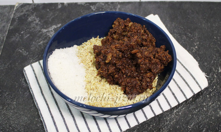 9. Изюм промойте, обсушите и тоже измельчите, добавьте его к орехам, всыпьте сахар.