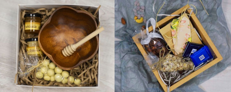 Классический, но всегда беспроигрышный вариант, который можно сделать уникальным. Вместо стандартных конфет можно выбрать наборы с крафтовыми продуктами, которые выглядят дороже своей реальной стоимости и имеют индивидуальный характер.- Наполнение: в набор можно включить баночки с мёдом от местного производителя, несколько видов качественного чая или свежеобжаренного кофе, а также ассорти из крафтового шоколада или имбирных пряников.